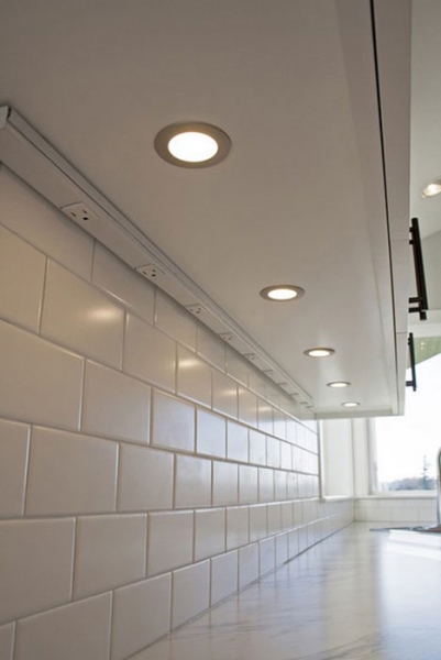 С помощью нехитрого устройства легко можно спрятать провода, устанавливая подсветку на дне настенных шкафчиков. Продумать нужно все наперед, чтобы изготовитель запланировал небольшую нишу для них.