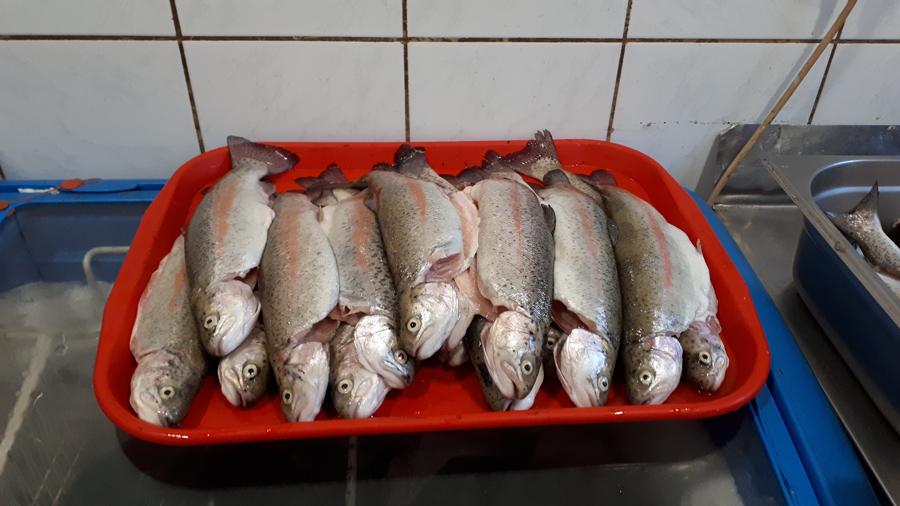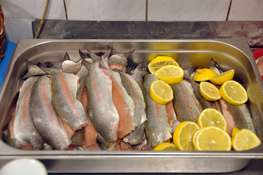 - Почистить рыбу от чешуи, выпотрошить и обработать на филе — отрезать голову, удалить кости. Головы не выбрасывать, они пригодятся для сервировки блюда. Хребты и кости будут использованы для приготовления соуса. Хвосты у форели немного подрезать, сохранив форму.