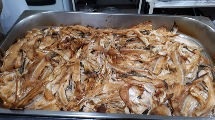 - Приготовить базу для соуса к рыбе: рыбные хребты и кости выложить на противень. Запечь их в духовке при температуре 180 градусов в течение 10-20 минут до золотистого цвета.