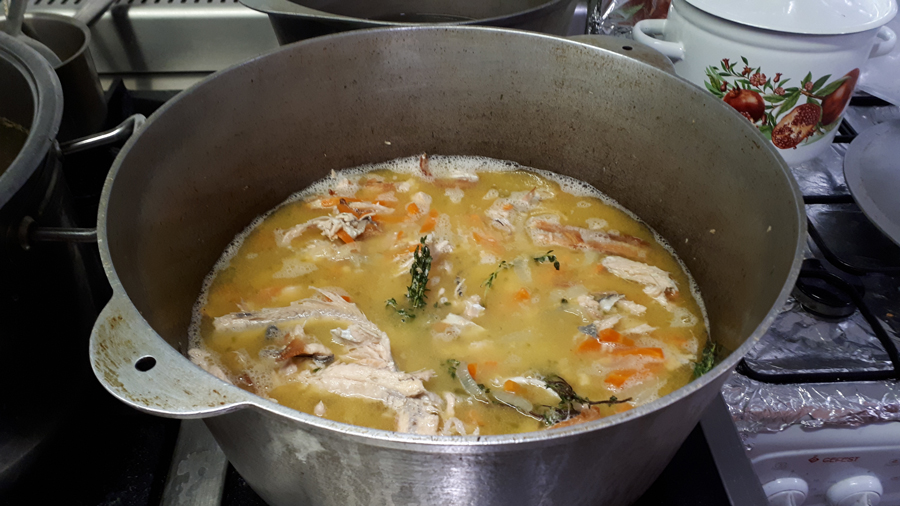 - В казане или глубокой кастрюле с толстым дном обжарить в сливочном масле до золотистого цвета морковь и лук. Затем добавить в казан запеченные кости и перемешать. Полученную массу залить водой, добавить тимьян. Варить в течение 30 минут на медленном огне.