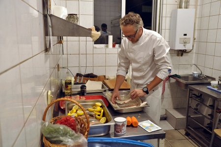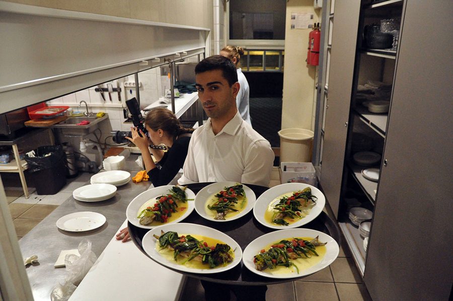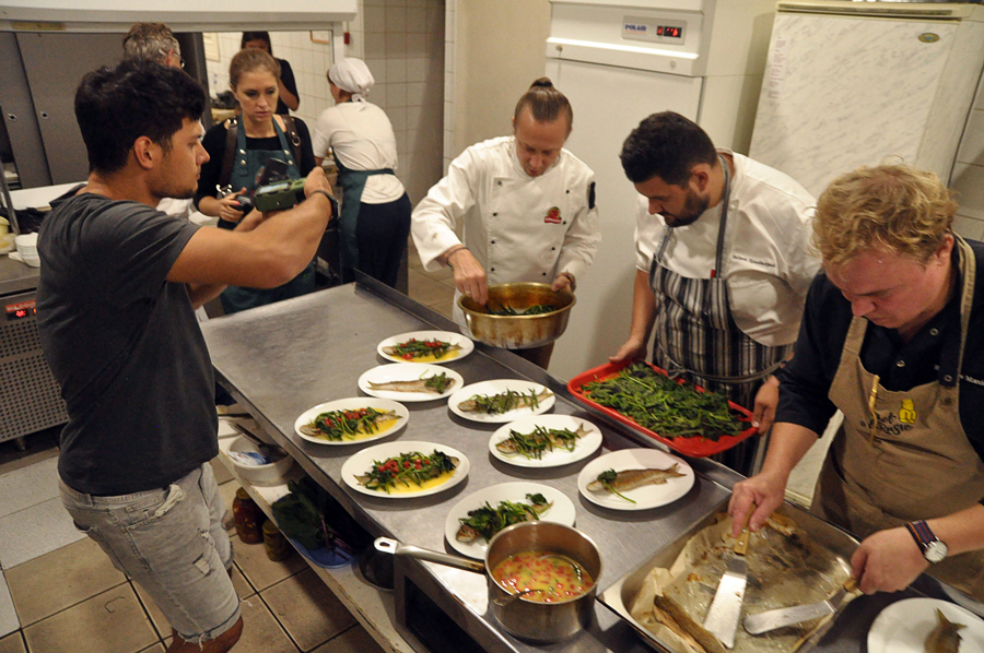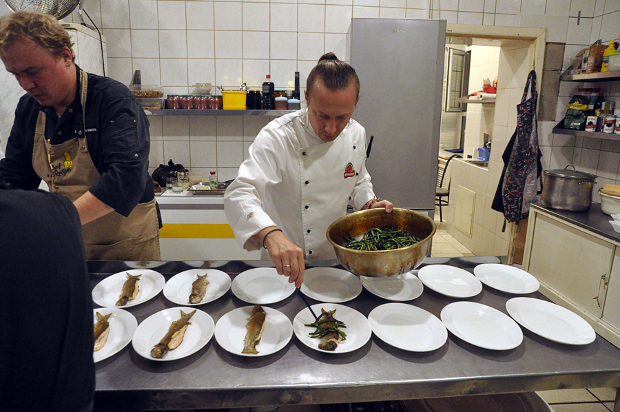 Вместе с участниками гастроквеста шеф-повар Денис Перевоз приготовил из местных продуктов форель на углях с зеленью: "Я за понятную и вкусную еду. Минимализм в ингредиентах вовсе не означает, что блюдо получится скучным. Внимание к деталям, игра на нюансах, продуманная подача — вот что помогает сделать простое блюдо особенным и незабываемым". Свежая рыба под изысканным соусом и легким гарниром из зелени стала главным блюдом ужина.