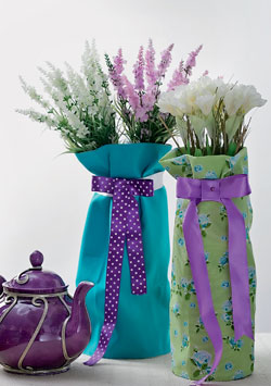 Вазочки. Букет цветов порадует любую женщину. Для того чтобы он был по-весеннему радостным, поставьте его в вазочку из ткани. Возьмите пластиковую бутылку и цветную ткань. Сшейте чехол, отрежьте горлышко у бутылки и наденьте на нее ткань. Завяжите бантик.