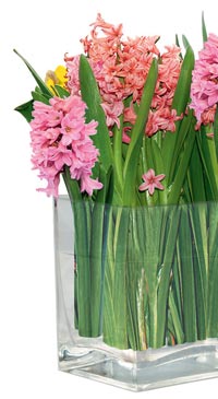 В прямоугольную вазу с острыми ребрами нужно ставить и столь же выразительные цветы. Вытянутые конусообразные гиацинты и бархатистые нарциссы, напоминающие крупные колокольчики, смягчат ее угловатые формы.