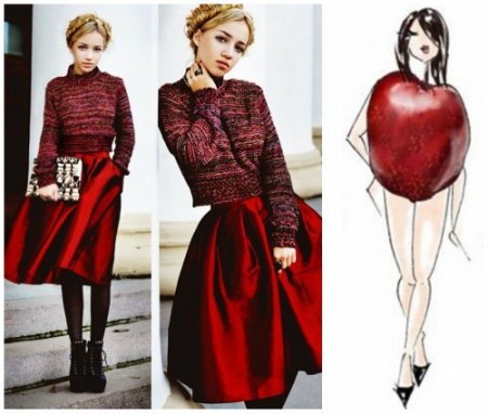 Так как ширина юбки визуально балансирует полный бюст и широкие плечи с одной стороны и тонкие ноги с другой, характерными для этой фигуры. Для фигуры Яблоко модели A-силуэта и колокола наиболее подходящие, но юбки-карандаш следует избегать.