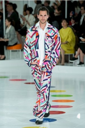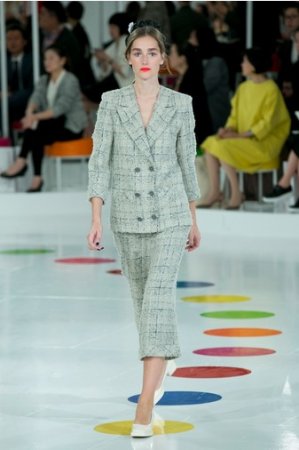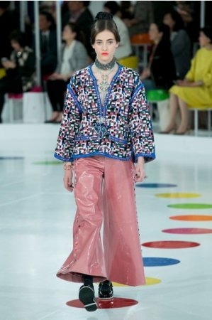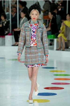 Настроение шоу можно было уловить, едва увидев дизайн помещения - подиум превратился в поле для игры в твистер, а зрители расположились на круглых разноцветных сиденьях. Именно цвету, вернее, сочетанию цветов была посвящена новая коллекция Карла Лагерфельда. Маэстро использовал жизнерадостные оттенки и не скупился на принты: калейдоскопические узоры, контрастные полоски, психоделические рисунки, фантазии на тему поп-арта - модели Chanel в этом сезоне получились бескомпромиссно позитивными. Кроме того, модельер хотел привлечь внимание зрителей к корейской культуре: «Мы много знаем о Китае и Японии. Но я не думаю, что кто-то наслышан о Южной Корее. И мне кажется, это отличная идея. Я покажу космополитичное видение местной моды».