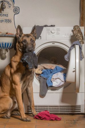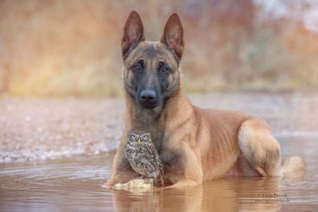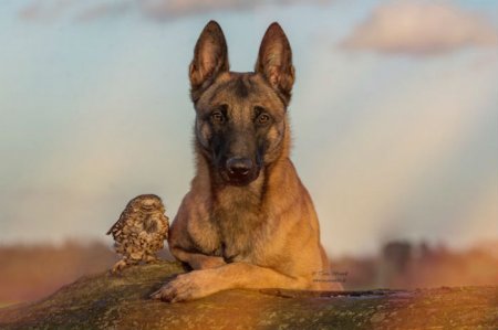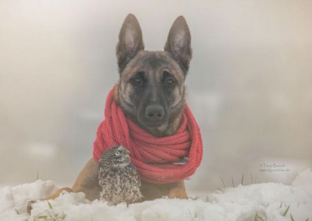 Сову из смешного цикла фото германского фотографа Тани Брандт(Tanja Brandt)зовут Польди. Таня решила задокументировать дружественные дела Польди и милой овчарки Инго, сделав прелестный фотоцикл, в каком чередуются фото в студии и на пленэре. Вот, Инго держит палку, на которой горделиво восседает малюсенькая сова, вот, они совместно почивают, слегка привалившись на мшистое дерево, вот, позируют в бесхитростных студийных декорациях.