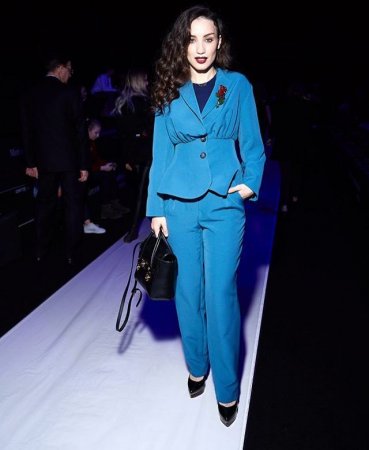 Знаменитая брюнетка блеснула перед публикой насыщенно-синим брючным костюмом, свободные прямые брюки которого были выгодно дополнены приталенным жакетом, удачный крой которого был призван визуально увеличивать объем груди носителя. Завершила элегантный стиль Виктории оригинальная, сплетенная из бисера брошь в виде алой розы, изящно приколотая к вороту жакета.