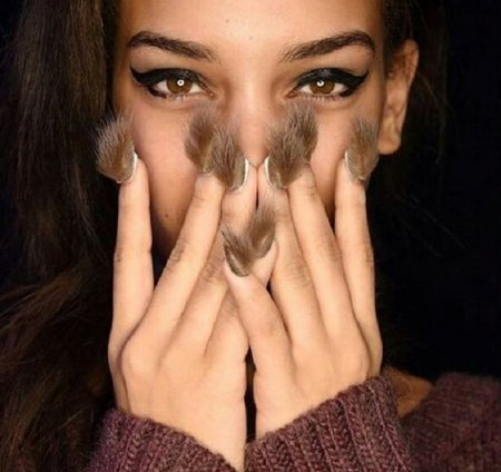 Милые дамы, настоятельно просим вас отказаться от подобных дизайнов. Ощущение меховых ногтей вызывает приступ неконтролируемого ужаса не только у ваших мужчин, но и у ваших домашних животных. Добавляя к таким излишествам кислотные цвета, есть шанс оказаться в топе подборок с худшим маникюром.