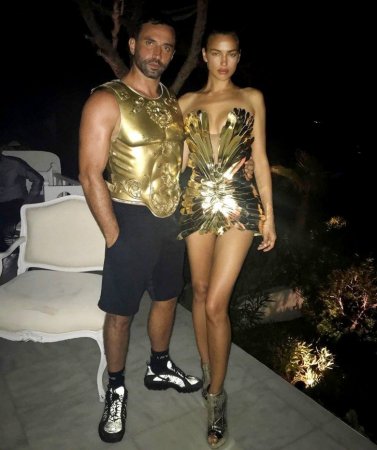 Шейк показала фигуру, ничуть не изменившуюся после рождения дочки Леи, которую она воспитывает с гражданским мужем Брэдли Купером. Ее короткое платье было составлено из отдельных металлических пластин золотого оттенка и подчеркивало длинные ноги селебрити. Свой образ Ирина дополнила ботильонами на шпильке с открытым носком в тон платью. Примечательно, что возлюбленного женщины рядом с ней не было – она веселилась в компании друзей, среди которых был креативный директор бренда Burberry Риккардо Тиши.