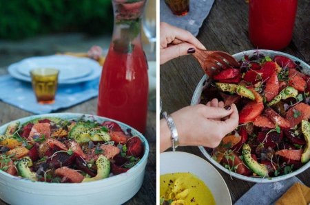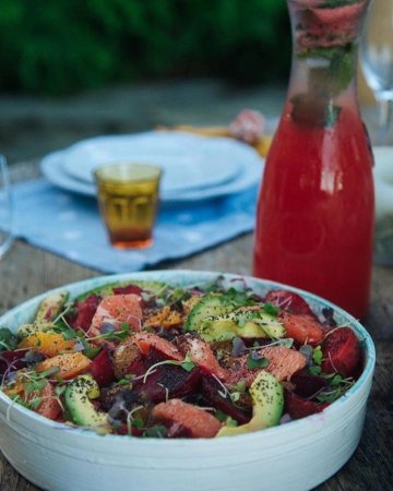 Ингредиенты:Салат:?1-2 авокадо?2 запеченных свёклы (можно замариновать)?1 грейпфрут, разобранный на сегменты?1 апельсин, разобранный на сегменты?Семена мака для красоты (можно чёрный кунжут)?Микрозелень (или любую вашу любимую зелень)?Заправка:?2 ст. л. апельсинового сока?1 ст. л. сока лимона?2 ст. л. любимого растительного масла?2 ч. л. кленового сиропа?Соль, перец по вкусу