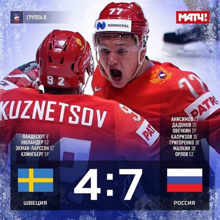 Напомним, позавчера наша сборная одержала оглушительную победу над сборной Швеции, забросив им 7 шайб. Сегодня ей предстоит сразиться со сборной США в матче за выход в полуфинал. Проигравшая команда покинет чемпионат. Сборная США в матчах группового турнира заняла 4 место в своей группе, выиграв 4 матча из 7-ми.Болеем за наших. Россия, вперед!