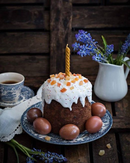 Процесс приготовления:1. Накануне выпечки куличей кладем клюкву и цукаты в миску и заливаем смесью апельсинового сока и рома, хорошо перемешиваем (примерно 100 мл рома и сок одного апельсина). 2. Масло комнатной температуры взбиваем с сахаром, добавляем яйца и снова взбиваем до пышной массы. Добавляем творог (творог заранее размять, перетереть до однородной массы), ванильный сахар, цедру апельсина, замоченные цукаты и клюкву (с жидкостью). Перемешиваем и всыпаем смешанную с разрыхлителем муку, перемешиваем до однородности, мешать долго не надо. Не забивайте тесто. 3. Формочки для выпечки застилаем пекарской бумагой (две формочки 14 см в ?) и заполняем на половину тестом. 4. Выпекаем в заранее разогретой до 160С духовке около 50-60 минут, ориентируйтесь на свою духовку. Готовность можно проверить лучинкой. Готовые куличи остужаем минут 10 в форме и затем на решетке. Украшаем глазурью и цукатами.5. Для глазури белок и сахарную пудру смешать и поставить на водяную баню. Взбить венчиком до однородной консистенции. Нанести глазурь на куличи.