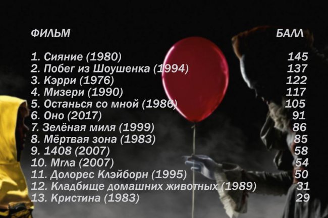 При создании абсолютного рейтинга учитывались оценки полнометражных фильмов, сериалов и мини-сериалов, созданных на основе произведений Стивена Кинга (таких 78 позиций), однако в итоговом списке оказались только кинокартины. Большинство из них вышли в 80-х годах. Это «Мертвая зона» (1983), «Кристина» (1983»), «Останься со мной» (1986), «Кладбище домашних животных» (1989) и нелюбимое Кингом «Сияние» (1980), которому в этом году исполняется 40 лет. Фильм Стэнли Кубрика сумел обойти «Побег из Шоушенка», который уже долгие годы занимает первую строчку топа-250 IMDb, крупнейшей базы данных о кинематографе. Из фильмов последнего десятилетия в рейтинге телеканала НСТ можно увидеть только «Оно», в 2017 году ставшим самым кассовым фильмом ужасов в истории (мировые сборы составили 701 млн долларов).