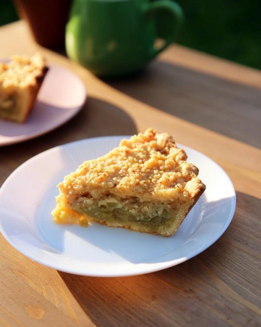 Процесс приготовления:1. Духовку разогреть до 200С. Смешать все ингредиенты теста. Выложить его в форму, выпекать 5-7 минут, затем снизить температуру до 180С, и выпекать еще примерно 15 минут.2. Смешать все ингредиенты начинки и потушить ее до мягкости ревеня. Выложить начинку. Если слишком много сока, то слить его и потом подавать в виде соуса с готовым пирогом.3. Смешать все ингредиенты крошки, растереть так, чтобы не было крупных кусочков. Выложить поверх ревеня. Выпекать еще 20 минут.