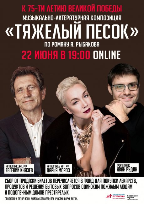 Музыкально-литературная композиция «Тяжелый песок» посвящена 75-летию Победы в Великой Отечественной войне. Это дань памяти павшим и поклон выжившим.В основу постановки лег роман Анатолия Рыбакова. Он был написан в 1978 году и посвящен трагедии холокоста и мужеству сопротивления. Это семейная сага, действие которой начинается в 1909 году и заканчивается восстанием в гетто в 1942 году. Выход романа стал сенсацией, так как впервые в русской литературе после 1930-х годов появилось произведение, посвященное почти исключительно еврейской жизни.Действие романа происходит в Черниговской области, в небольшом еврейском городке на Украине. Таких гетто в этих областях, на границе Витебской, Псковской губерний и в Белорусии в 1941-1942 годах было очень много. Они были выжжены фашистами, и до наших дней практически не дошло документальных источников о происходивших там событиях.22 июня, в день начала Великой Отечественной войны, в Еврейском музее и центре толерантности роман прочитают народный артист РФ, ведущий актер Театра им. Евгения Вахтангова Евгений Князев и заслуженная артистка РФ, ведущая актриса МХТ им. Чехова Дарья Мороз. За роялем — выдающийся музыкант, художественный руководитель Московского Государственного Симфонического Оркестра, Иван Рудин.Организатор трансляции — Благотворительный фонд «Семейная в помощь».Фонд был создан сетью клиник «Семейная» для помощи домам престарелых, одиноким пожилым людям и ветеранам. Врачи клиники регулярно оказывают медицинскую помощь, а фонд на собранные с продажи билетов на спектакли средства закупает лекарства и помогает с решением бытовых вопросов. Каждый купленный билет на трансляцию — это помощь бабушкам и дедушкам, оплата лекарств ветеранам и покупка еды, оплата ЖКХ и приведение жилищных условий в нормальное состояние. Только вместе мы можем сохранить память о страшных годах Великой Отечественной войны, не допустить повторения случившегося и помочь ветеранам и детям войны достойно прожить старость.Билеты на трансляцию можно приобрести по ссылке.