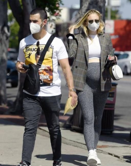 Однако недавно поклонникам удалось увидеть актрису на прогулке с супругом. На этот раз беременность Софи не скрывала: она появилась в лосинах серого цвета, подчеркнувших заметно округлившийся живот, белом топе и куртке. И Софи, и Джо для прогулки воспользовались респираторами, ведь в США сохраняется тяжелая эпидемиологическая ситуация из-за коронавируса.