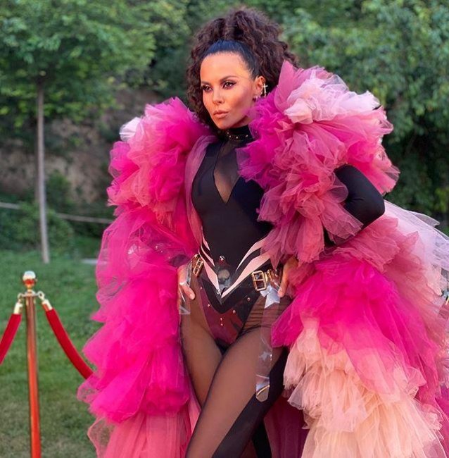 Пояс и горловина наряда были дополнены металлическими украшениями, за счет чего Каменских выглядела настоящей хищницей.Добавили агрессии образу также высокий хвост и яркий вечерний макияж знаменитой красавицы. Завершающим штрихом стал широкий чокер на шее Насти и пышное розово-персиковое боа, которое великолепно гармонировало с черным цветом комбинезона.