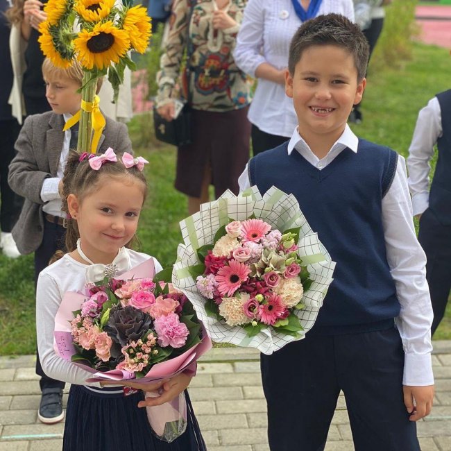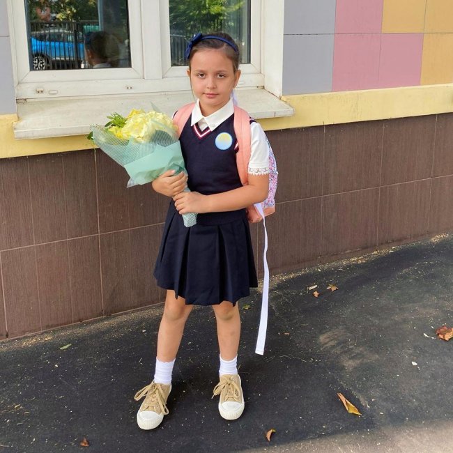 С букетом желтых роз отправилась в школу семилетняя дочь Басты и Елены Пинской Василиса. Судя по фото, к новой для себя роли девочка отнеслась очень серьезно.