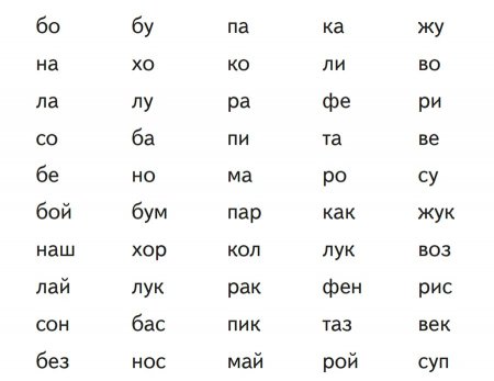 3. Слоги за "шторкой". Читаем на одном выдохе столбики буквосочетаний (сколько хватит дыхания). Закрываем их "шторкой" (листом бумаги, календариком, открыткой и др.). "Шторку" ведём достаточно быстро сверху вниз, не останавливаемся. Задача ребёнка — увидеть и прочитать. Упражнение не только помогает увеличить скорость чтения и переключаемость внимания, а также тренирует память и речь.
