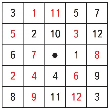 5. Таблица Шульте. Ребёнок должен смотреть на точку в центре таблицы и, не бегая глазами по ячейкам, используя боковое (периферическое) зрение, называть по порядку все числа, буквы или пары (цифра + буква). Задача состоит в том, чтобы выполнить задание за определённое время. Начинайте с 30 секунд. Постепенно уменьшайте время до 8–10 секунд.