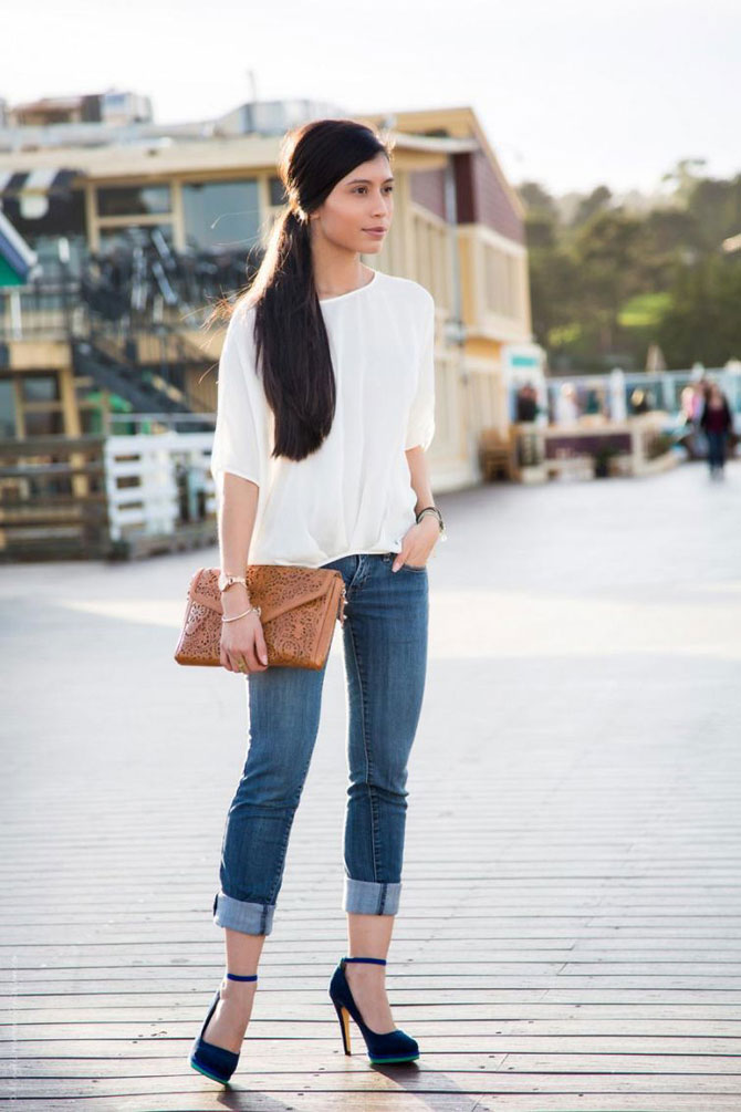 Чтобы смотреться выше, избирайте однотонные комбинезоныТуфли с ремнём на