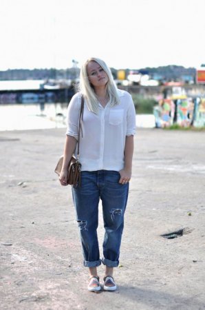 Широкие мешковатые джинсы на пару размеров больше, утяжелят ваш наружный вид и сделают вас ещё меньше