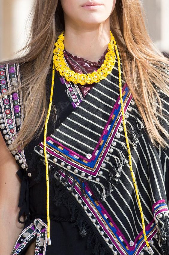 Контрастные или в тон наряду украшения из кожи или бечёвки украшены металлическими кольцами или заплетены в технике макраме. Giorgio Armani представил целый каскад из веревочек, который создаёт приятную подвижность всему наряду. Очень эффектно такие шнуровки выглядят с одеждой по мотивам афроо-американского стиля. Концы шнуров длиной в основном достигают бёдер.