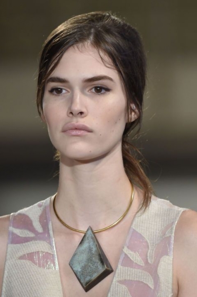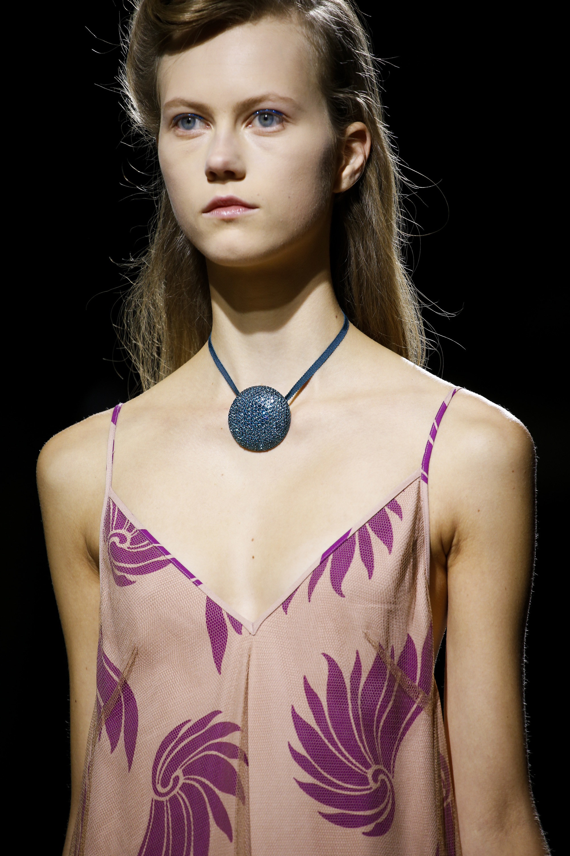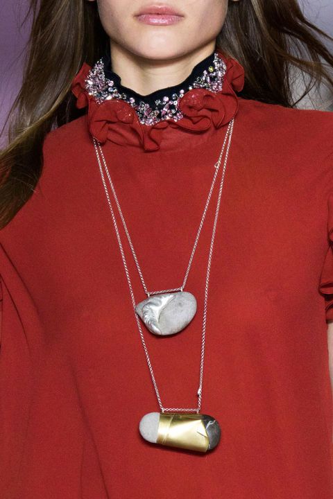 Целый ряд именитых дизайнеров обратился к теме крупной подвески. Это заметные камни, бусины или жемчужины чётких геометрических форм на тонком металлическом шнуре или, наоборот, кулоны, напоминающие естественные природные формы и необработанные породы.