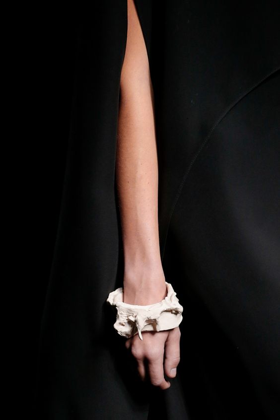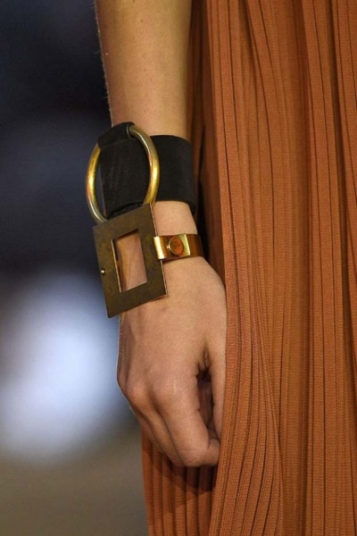 Массивные и заметные браслеты из различных материалов, которые в этом сезоне можно носить как вместе, так и раздельно есть буквально в любой коллекции. Очень многие выполнены в духе футуризма геометрическими фигурами и орнаментом.