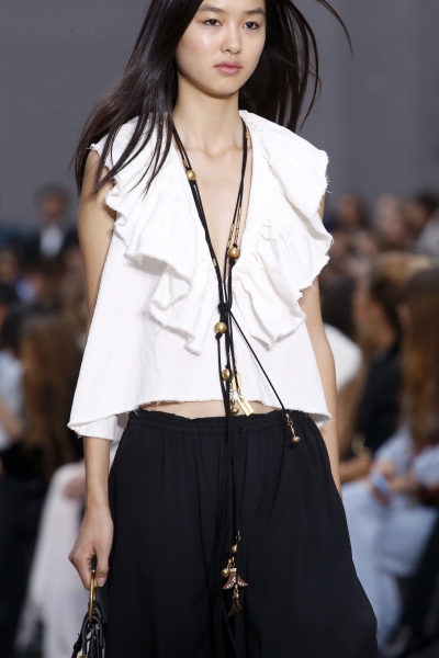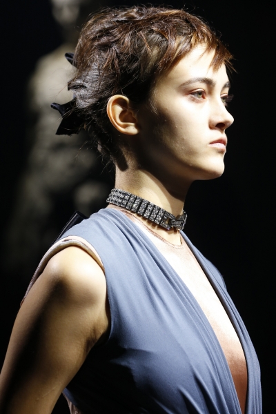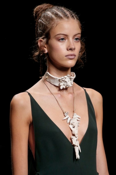 Etro и Lanvin предложили несколько вариантов чокер из ткани. И те и другие были украшены цветами. Ботаническая тема одна из основных в будущем сезоне. Второй по популярности вид чокеров это массивные украшения-ошейники, выполненные из тяжёлых материалов вроде металла, жемчуга, кожи или кости.