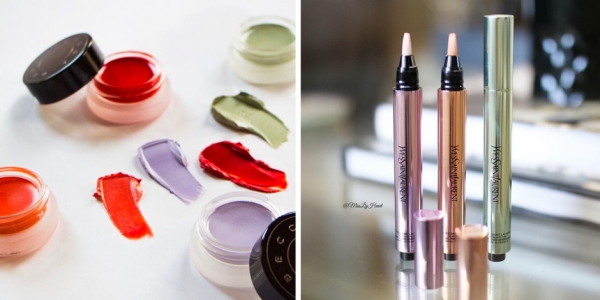 Подобные цветные средства выходят во всех возможных форматах. Самые плотные кремовые стики лучше подходят для локального применения (корректоры или консилеры), средние — основы или хайлайтеры — для коррекции общего тона. И наконец разноцветные пудры тоже корректируют оттенок кожи, но совсем слегка.
