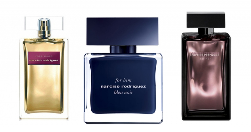 Ароматы с нотой мускуса, слева направо: цветочный древесно-мускусный Rose Musk, древесный пряный Bleu Noir For Him, цветочный древесно-мускусный Musk for Her, все Narciso Rodriguez.