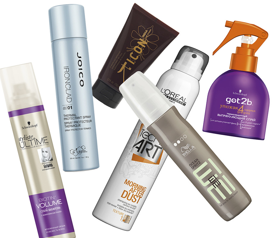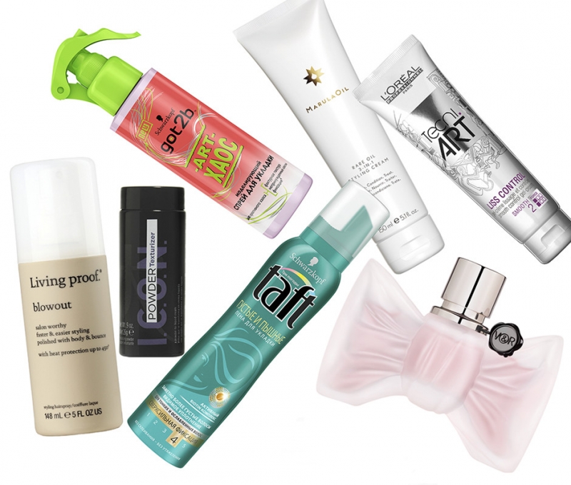 По часовой стрелке: крем для укладки Marula Oil Rare Oil 3-in-1 Styling Cream, Paul Mitchell; гель-крем Techni.Art Liss Control, L’Oreal Professionnel; парфюмированный спрей для волос с ароматом духов Bon Bon, Victor & Rolf; пена для объема Taft «Густые и пышные», Schwarzkopf; термозащитный спрей Blowout, Living Proof; текстурирующая пудра Powder Texturizer, I.C.O.N; моделирующий спрей got2b «Арт-хаос», Schwarzkopf.