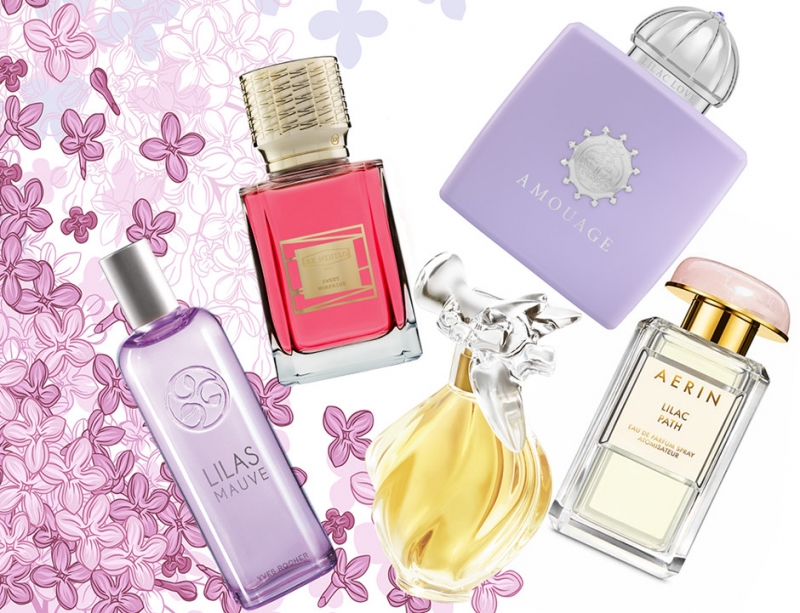 Ароматы с нотой сирени, по часовой стрелке: Lilac Love, Amouage; Lilac Path, Aerin; L’Air du Temps, Nina Ricci; Lilas Mauve, Yves Rocher; Sweet Morphine, Ex Nihilo.