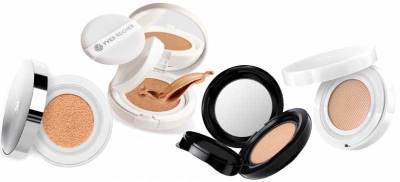 Кушоны, слева направо: антивозрастной Miracle Cushion SPF 23, Lancome; увлажняющий Pure Light Light Foundation Cushion, Yves Rocher; компактная тональная основа Matchmaster Shade Intelligence Compact Foundation, M.A.C; матирующий ВВ-крем-вуаль Air Mesh SPF 30, Dr. Jart.