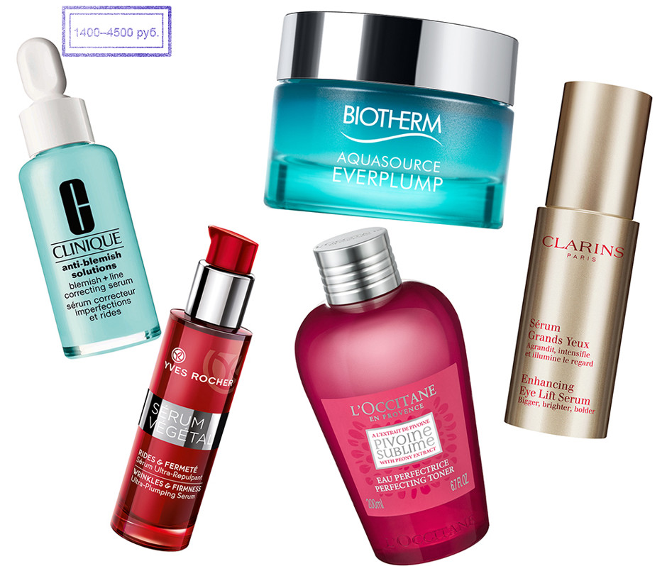 По часовой стрелке: увлажняющий гель Aquasource Everplump, Biotherm; лифтинг-сыворотка для век Serum Grands Yeux, Clarins; тоник Pivoine Sublime, L'Occitane; антивозрастная сыворотка Serum Vegetale, Yves Rocher; корректирующая сыворотка Anti-Blemish Solutions, Clinique.