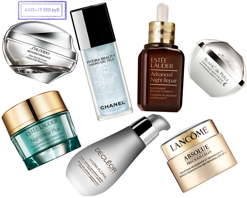 По часовой стрелке: ночная сыворотка Advanced Night Repair, Estee Lauder; осветляющий ночной крем Blanc de Perl, Guerlain; антивозрастной крем Absolue Precious cells, Lance; увлажняющий флюид Hydra Florale SPF 30, Decleir; ночной детокс-крем Night Wear Plus, Estee Lauder; крем для сияния кожи Bio-Performance, Shiseido; увлажняющий гель для век Hydra Beauty Micro gel Yeux, Chanel.