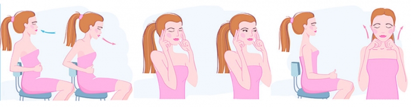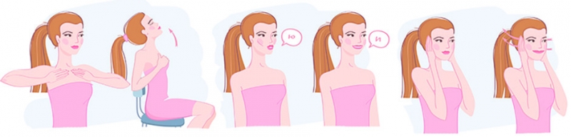 Упругая кожа: поместите ладони на щеки так, чтобы лицо оказалось внутри образованной руками «чаши». Расслабьте мышцы лица и сильно надавливайте на лицо ладонями. Удерживайте ладони в этом положении 5 секунд, затем отпустите.