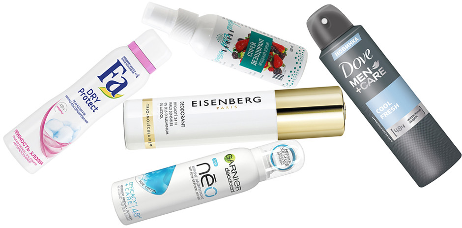 Дезодоранты-спреи: Dry Protect «Нежность хлопка», Fa; «Ягодный взрыв», «Камали»; Cool Fresh, Dove Men+Care; Trio Moleculaire, Eisenberg; Neo «Чистота хлопка», Garnier.