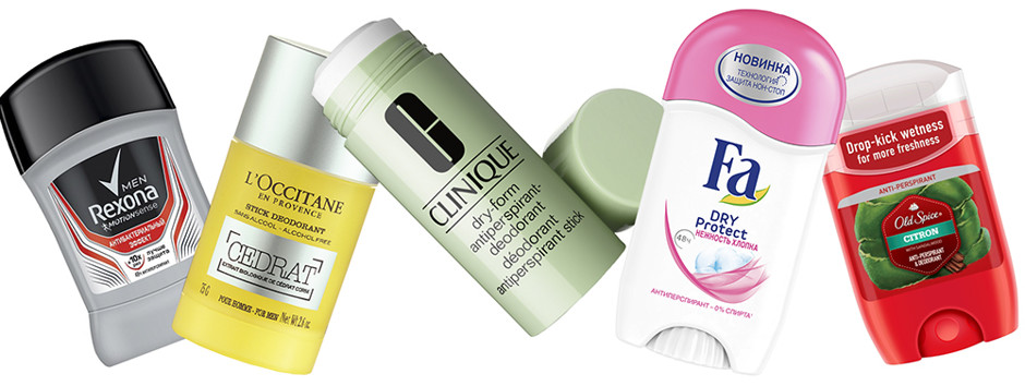У дезодоранта-стика, ролика и крема разная форма выпуска, но практически одинаковый состав: соли алюминия, экстракты растений с успокаивающим, дезинфицирующим, подсушивающим действием. По статистике их эффективность на втором месте после спреев. Стиком надо провести по коже вверх-вниз 2—3 раза, дать высохнуть и только потом одеваться, чтобы избежать скатывания текстуры и следов на одежде.