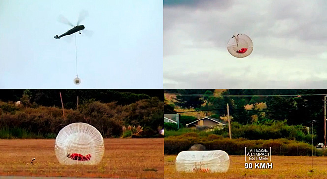 В итоге краш-манекену довелось полетать в небе Калифорнии в зорбе, в обертке из пузырчатой пленки, и в зорбе без всякого снаряжения. Увы, по результатам датчиков ни один из этих способов не был рекомендован разрушителями для последующего применения в десантных войсках. Жаль, окончательно. Армия десантников, скидываемая на соперника в зорбах, на наш вкус, смотрелась бы хорошо!