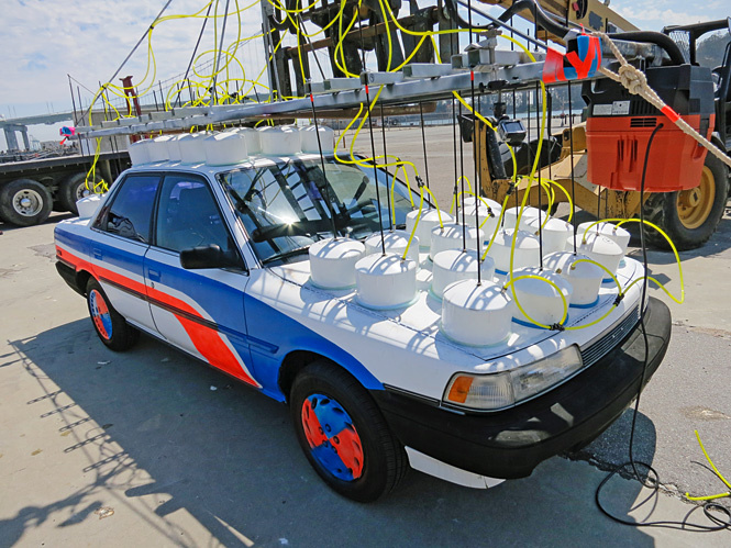Адам начал с того, что соорудил около 40 пластмассовых присосок с силиконовыми краями, которые длинноватыми трубочками были соединены со специальной насадкой на пылесосный шланг. Каждая присоска при поддержки стального прута была прикреплена к стальной раме, которую обязан был подымать вверх подъемный кран. Присоски устанавливались на багажник, капот и крышу обычного седана. То есть кран поднимал бы железную раму с присосками, а пылесос обеспечивал бы присасывание к ним кара. Стоило его выключить — и седан летел бы вниз ( ежели бы его удалось поначалу поднять вверх). Конечно, эту конструкцию просто надобно созидать, чтоб понять инженерный размах!Впрочем, с первого раза ничего не вышло. От земли удалось оторвать лишь три колеса.