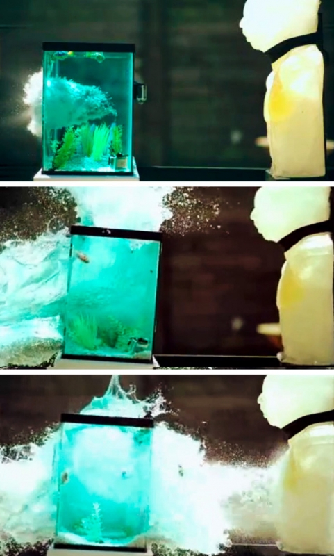 В первом случае стреляли кучей чрезвычайно малюсеньких шариков: чем меньше объект, тем меньше противодействие воды, а чем шариков больше, тем великую ударную волну они создадут. В итоге первую стенку пробивает сама дробь, далее шарики утрачивают свою энергию, но вызванная ударная волна вышибает заднюю стенку. Манекен влажный, но «живой». Во втором случае шариков меньше, но сами они больше: прытче утрачивают энергию, да и волны творят поменьше — даже стена цела. В третьем случае заместо кучи шариков стреляли одним огроменным кусочком свинца: он прытче всех утрачивал энергию, но вначале ее у него было еще больше, чем у отдельно взятого шарика, потому заднюю стенку он пробил, но манекен также не пострадал.