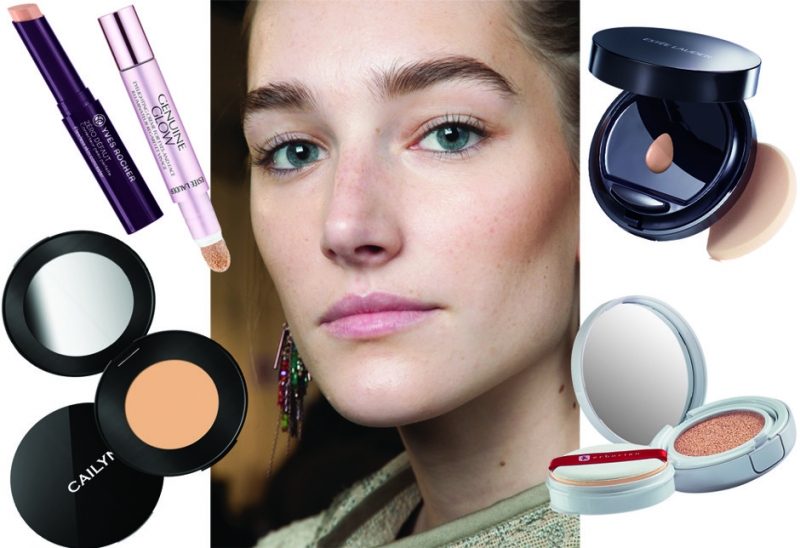 Консилер Zero Defaut, Yves Rocher; крем для сияния кожи век и лица Genuine Glow, Estee Lauder; консилер Coverage Consealer, Cailyn; компактный тональный крем Double Wear To Go, Estee Lauder; ВВ-кушон, Erborian.