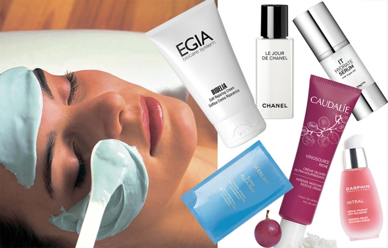Средства для лица после загара: крем Bioelia, Egia; флюид Le Jour de Chanel, Chanel; сыворотка It Hydrate Serum, Cailyn Spa; тканевая маска Super Aqua-Mask, Guerlain; крем Vinosource Riche, Caudalie; сыворотка Redness Relief Soothing Serum, Darphin.