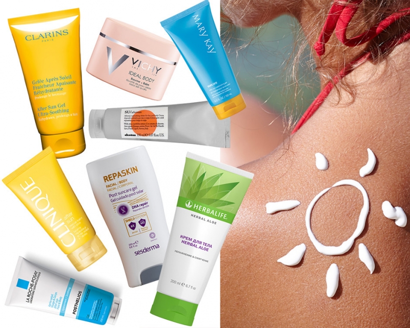 Восстановление кожи лица и тела после загара: гель After Sun Gel Ultra-Soothing, Clarins; бальзам Ideal Body, Vichy; гель Sun Care, Mary Kay; крем SU Aftersun, Davines; гель Posthelios, La Roche-Posay; гель Repaskin, Sesderma; крем Herbal Aloe, Herbalife.