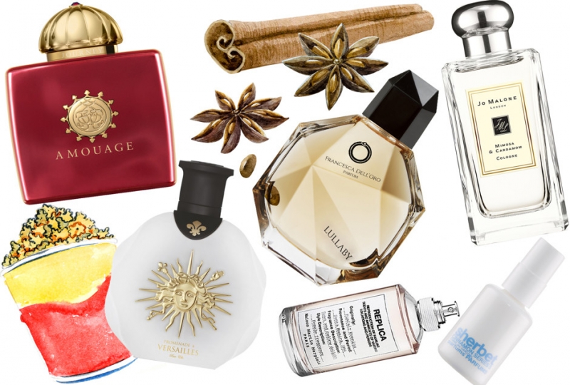 Journey с нотой мёда и кардамона, Amouage; Promenade a Versailles Pour Elle с нотой попкорна, Parfums du Chateau de Versailles; Lullaby c нотой кокоса, Francesca dell'Oro; Mimosa & Cardamom с нотой кардамона, Jo Malone; Replica Funfair Evening с нотой сахарной ваты, Maison Margiela; Sherbet Cinnamon Series 5 с нотой корицы, Comme des Garcons Parfums.