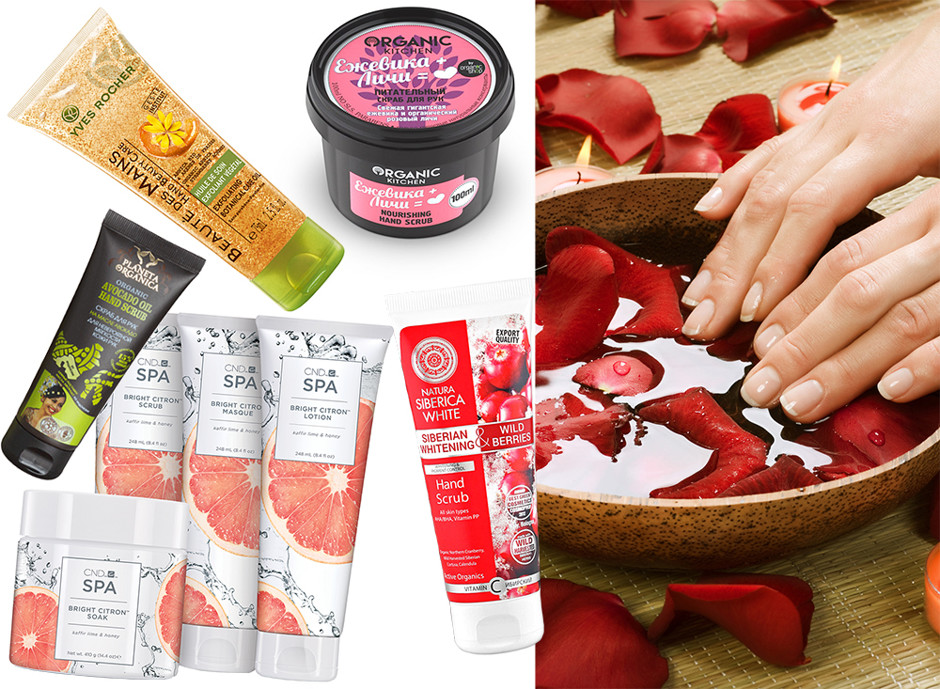 Скрабы для рук: Exfoliating Botanical Care Oil, Yves Rocher; «Ежевика + Личи», Organic Kitchen; Siberian Whitening & Wild Berries, Natura Siberica; линия для кожи рук Bright Citron, CND Spa; Avocado Oil Hand Scrub, Planeta Organica.