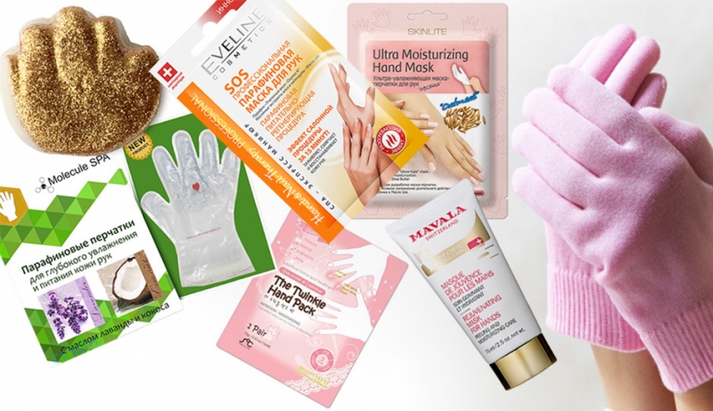 Маски для рук: горячая «Золотые руки», Lush; парафиновые перчатки, Molecule Spa; SOS парафиновая профессиональная, Eveline; увлажняющие перчатки The Twinkle Hand Pack, SOC; увлажняющие перчатки «Овсянка», Skinlite; маска-пилинг Rejuvenating Mask for Hands, Mavala.