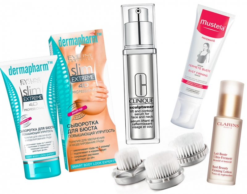 Сыворотки для шеи, декольте и груди: Slim Extreme, Eveline; Sculptwear, Clinique; Bust Firming, Mustela; Bust Beauty Firming Lotion, Clarins; насадки для кожи декольте для очищающей щетки Clarisonic.